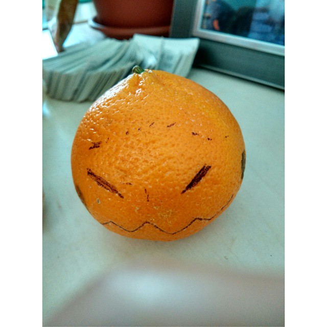 Мне подарили апельсин, но я не могу его есть. Он так печально на меня смотрит )) / I’d been given an orange, but I can’t eat it, he’s so sad))